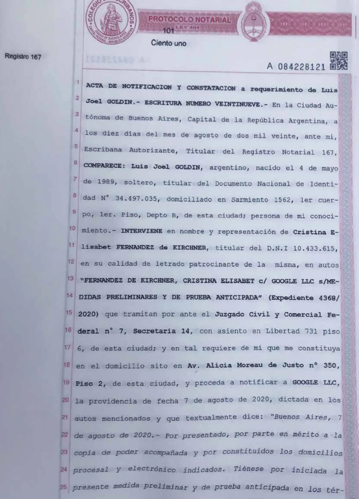 El pasado viernes 7 de agosto, el juez en lo Civil y Comercial Federal, Javier Pico Terrero, hizo lugar a la solicitud de prueba anticipada presentada por los abogados de Cristina Fernández de Kirchner, por la difamaciones publicadas en el panel de conocimiento de la página principal de Google.