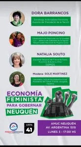 La referente del Ministerio de Desarrollo Social de la Nación, Lorena Barabini, invitó a la charla que se realizará hoy con Dora Barrancos, Majo Poncino y Natalia Souto sobre Economía Feminista como Política Pública, a las 17 horas en AMUC, Neuquén.
