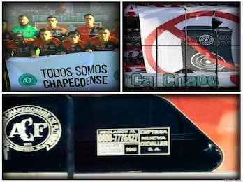 Pero no solo dentro del campo de juego se recordó a las victimas fatales, porque los micros que trasladaban a sendos equipos, también lucieron la helvética del conjunto de Chapecó. Lo mismo sucedió en una de las cabeceras del coloso, más precisamente en la tribuna Diego Armando Maradona, y rezaba la leyenda "Forca Chape".