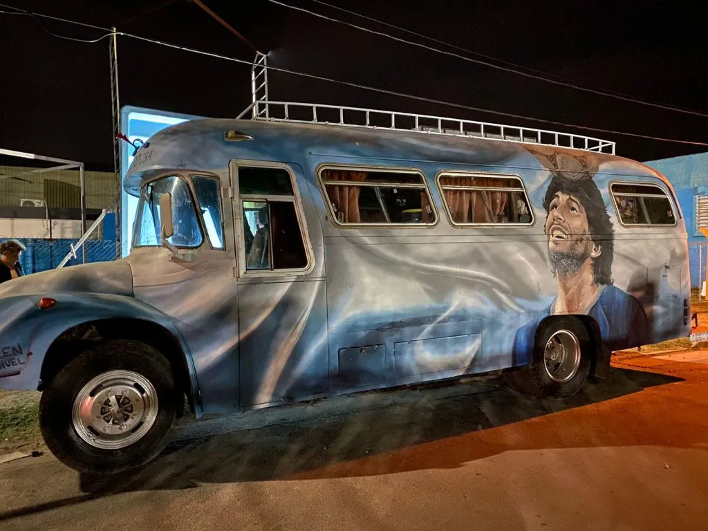 El vehículo tiene en sus costados las imágenes de Lionel Messi y Diego Armando Maradona, embanderados con los colores celeste y blanco.
