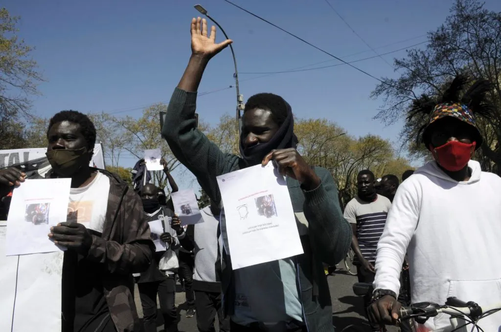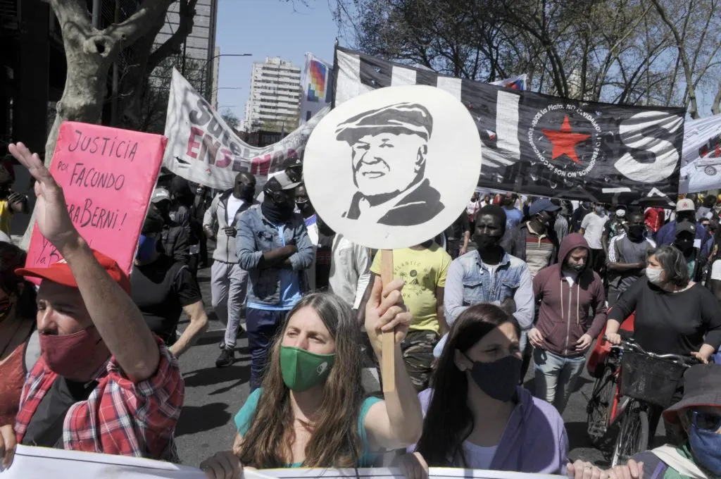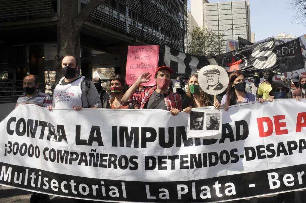 Los manifestantes concentraron en Plaza Moreno, frente al Palacio Municipal, donde en 2006 se realizó el juicio al exrepresor Miguel Etchecolatz y de allí, respetando el distanciamiento social, se dirigieron hasta la Gobernación bonaerense.