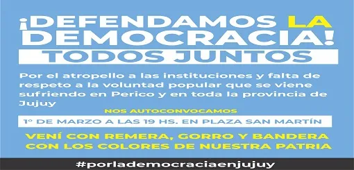 Mónica Alanís, Directora de Instituto Intermedias de Perico, afirmó que "Perico esta convulsionado, institucionalmente es un momento difícil el que estamos viviendo, la suspensión del Intendente tiene que ver con malos manejos y la Justicia es lenta y hay mucho silencio de sectores políticos y sociales. Por eso esperando saber que va a ocurrir en Perico, vamos a realizar mañana miércoles a partir de las 19hs donde autoconvocados marcharán para defender la democracia sin colores políticos".