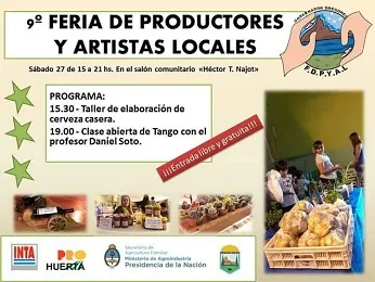 Este sábado 27 de mayo se realizará la 9° feria de productores y artistas locales en el salón comunitario de Gobernador Gregores. Las actividades comenzarán a las 15 horas con la apertura del espacio, en tanto que las 15.30 se brindará un taller de elaboración de cerveza casera y a las 19 un taller de tango. Así lo informó Daniela Suque de la SAF a Nacional y comentó que en esta oportunidad habrán 20 productores y un gran número de artistas locales.
